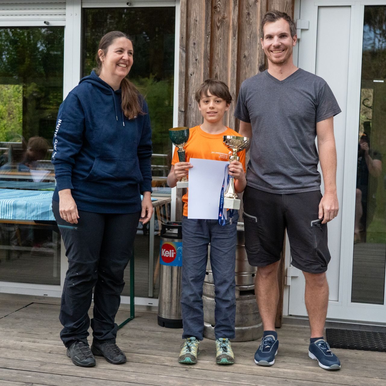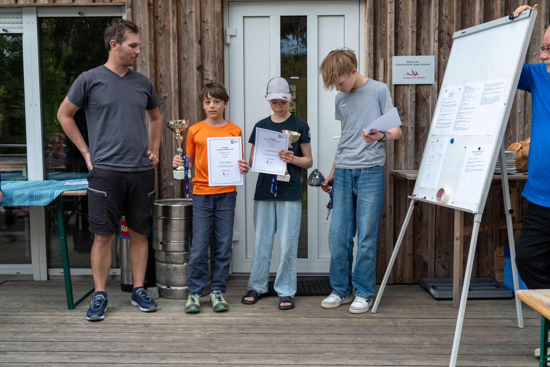Am Sonntag hat uns der Wind noch sehr überrascht. Für einige Wettfahrten mussten wir uns alle in Ölzeug packen, da die Boote vom Regen nass waren. Wir sind zwar ein paar Wettfahrten gefahren, mussten dann aber unterbrechen, da der Wind wieder aufgehört hat. Also wurde wieder gespielt und wir hatten sogar Zeit einen Abstecher aufs Dorffest zu machen. Am Nachmittag gingen dann doch noch eine paar Wettfahrten mit viel Wind. Am Ende haben wir alle gemeinsam die Boote abgebaut und gekrant.